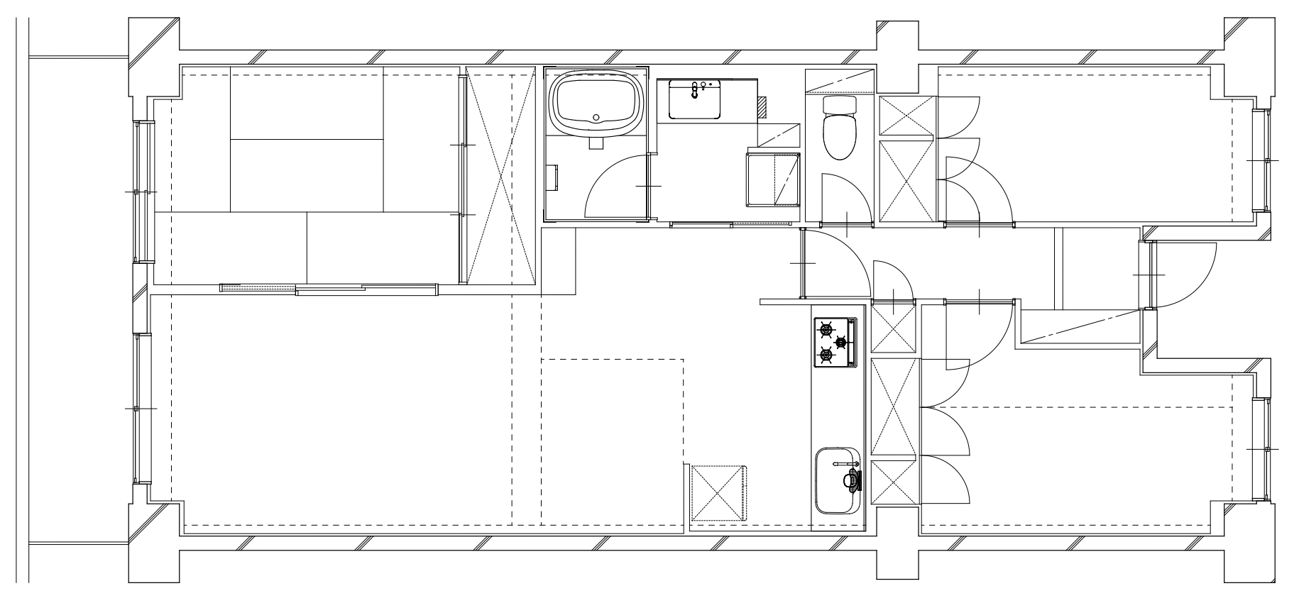 当物件のような分譲ファミリーマンションにおいて、間取り変更や建具の交換などを行わない全面改修であれば、こちらの金額を目安として実現が可能です。