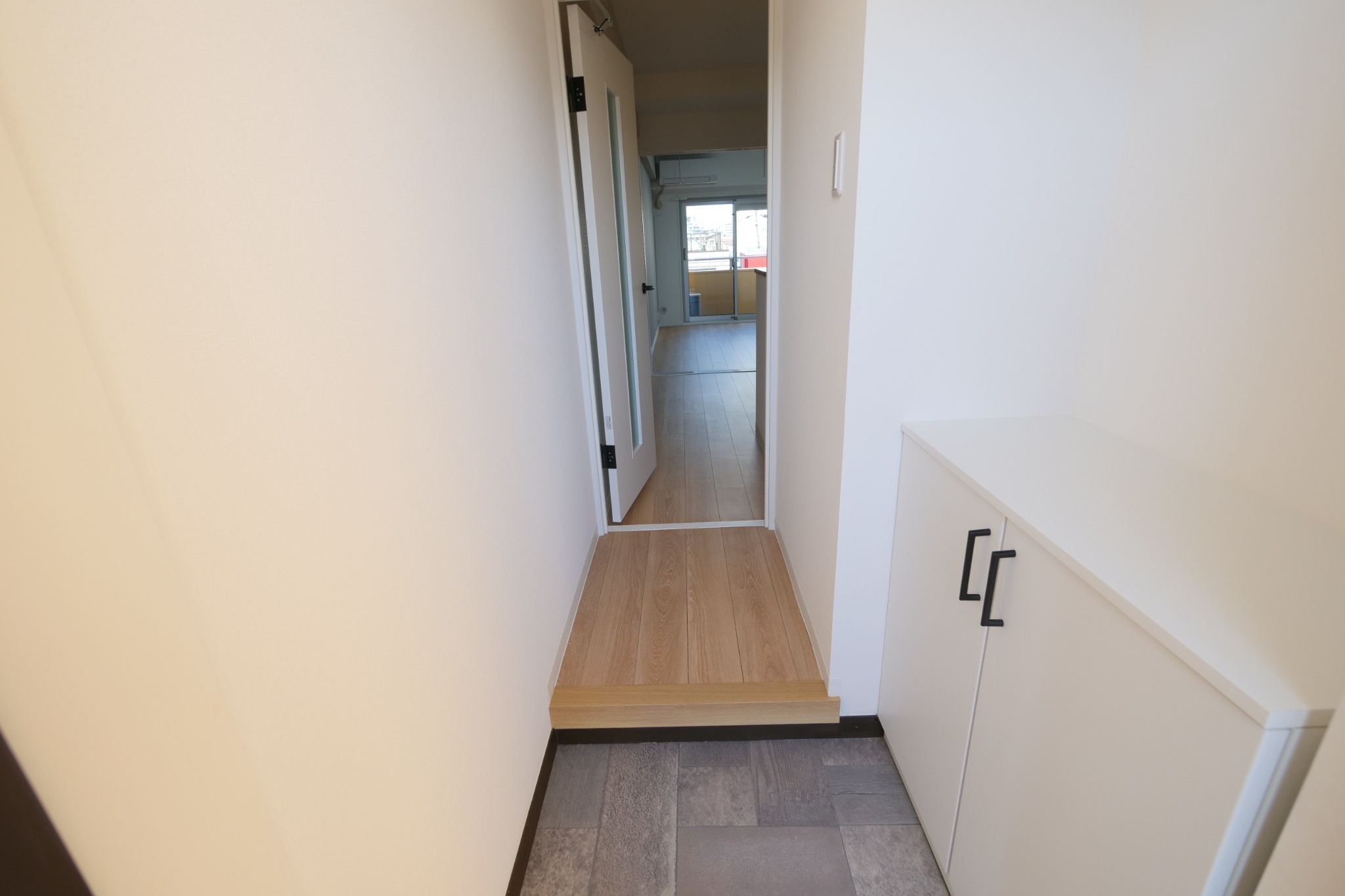 下駄箱を新設して、上部にはダウンライトも完備しました。
